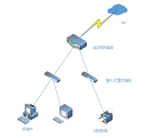 1、基本網(wǎng)絡(luò)可以以單出口處部署一臺(tái)低端路由器,采用NAT技術(shù)以及采用默認(rèn)路由的出局方式。